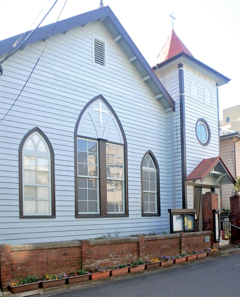 1919年、アメリカの福音派系の礼拝堂として建てられた教会。関東大震災や戦災にも耐えた貴重な日本の近代洋風建築の一つ。礼拝堂は、牧師が立つ壇が隅にあり、扇型に長椅子を取り囲むよう配置されており、会衆が集中して牧師の話を聴ける設計。国登録有形文化財として登録されました。