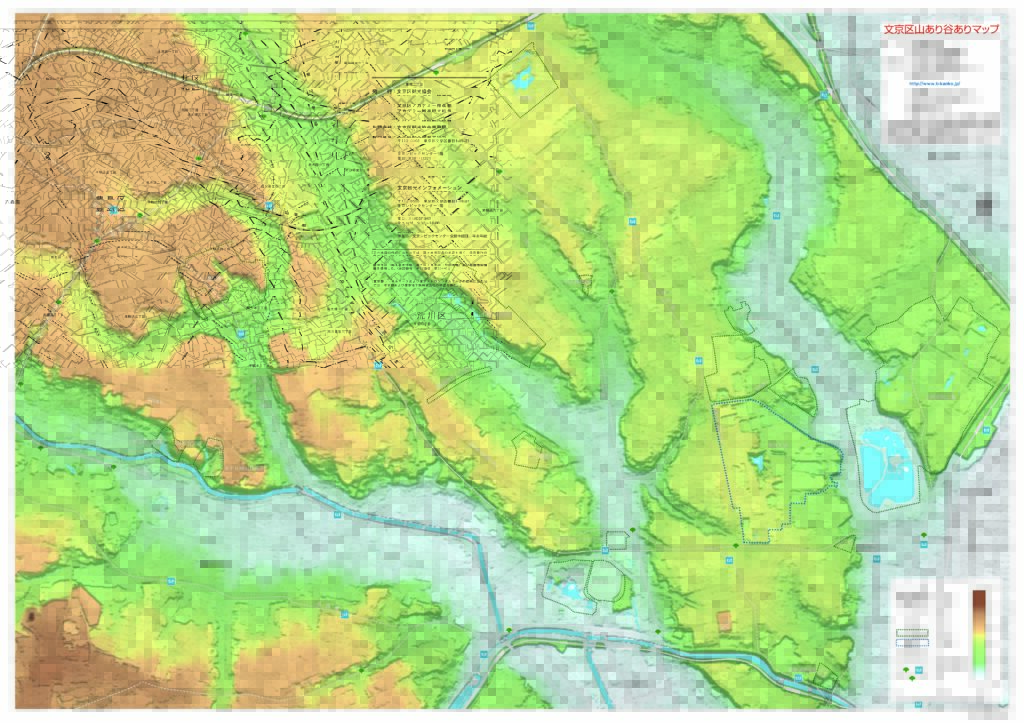 ~115の上り下り~また、文京区内には坂道が多く、歴史散歩とともに、健脚自慢の方々のまち歩きコースとしても人気です。 東京23区では、港区に次いで坂の数が多い文京区。 武蔵野台地の東端に位置する文京区の地形は、江戸川(神田川)や千川・藍染川(ともに現在暗渠)などにつくられた低地の部分と、関口台・小日向台・小石川台・白山台・本郷台という5つの台地。そして、浸食によってできた幾つもの谷によって構成されており、こう配の急な坂と崖が多数存在します。その数は1000箇所以上ともいわれ、名前のついている坂だけで115個*もあります。 *参考文献:「ぶんきょうの坂道」ふるさと歴史館
