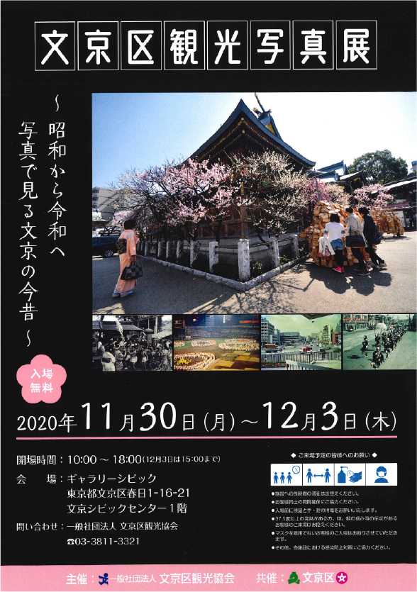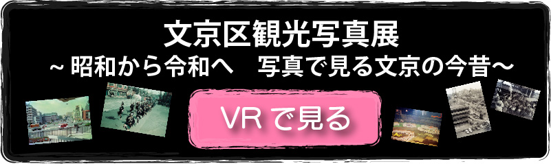 本年11月30日(月)~12月3日(木)にギャラリーシビックにて開催いたしました『文京区観光写真展展~昭和から令和へ 写真で見る文京の今昔~』の様子をパソコンやスマートフォンでご覧いただけるバーチャル(VR)写真展をオープンいたしました。 会場内で再生されていたスライドショーの動画もご覧いただくことができます。 ぜひ、実際の会場の臨場感をお楽しみください。