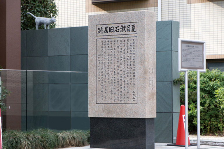この地で生まれた作品『我輩は猫である』にちなんで、記念碑のそばに猫のオブジェが設置されています。