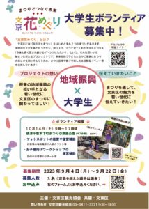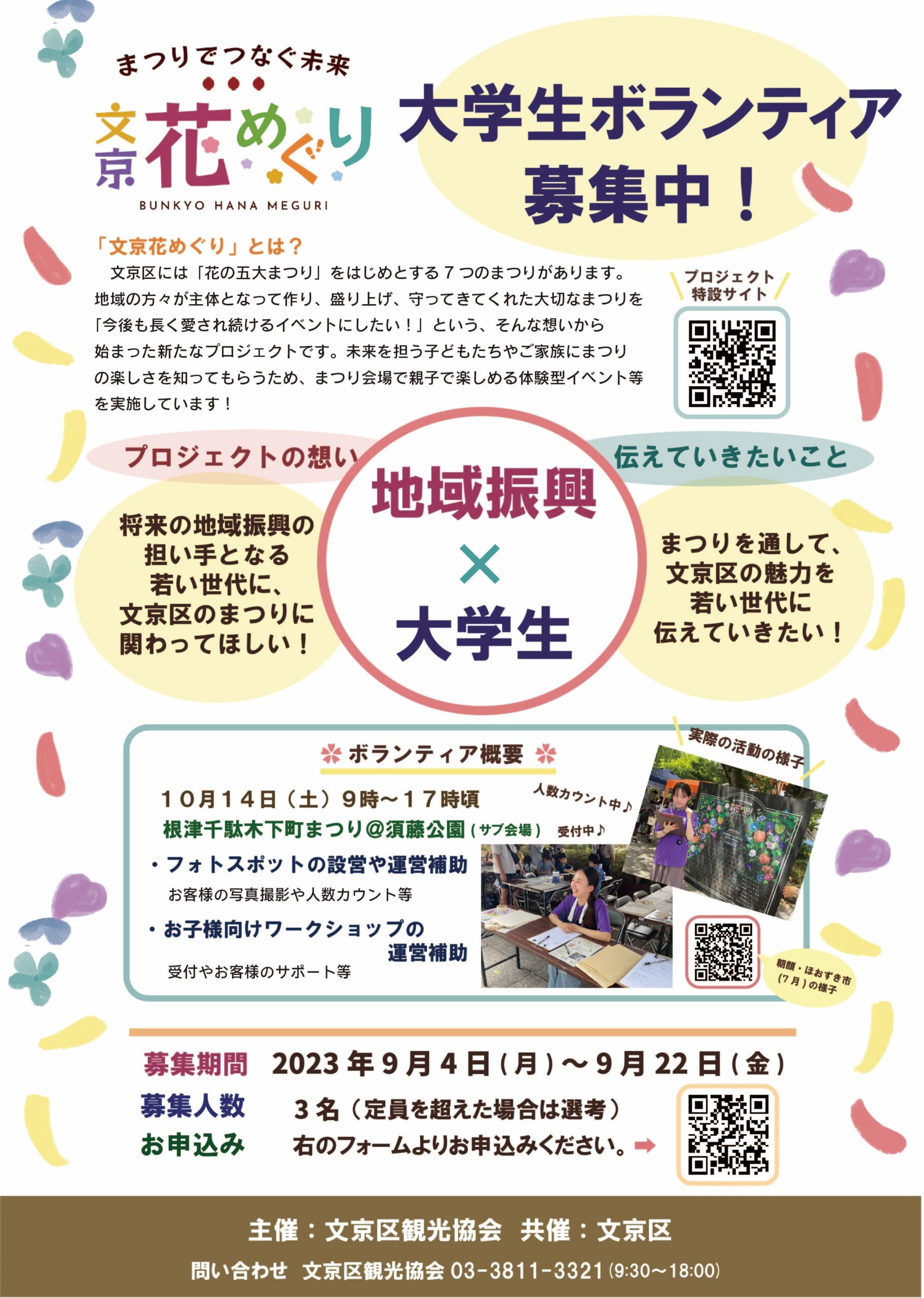 【終了】まつりでつなぐ未来 文京花めぐり✿ 大学生ボランティア募集のお知らせ 2023.08.25 ★こちらの募集は終了しました。ご応募ありがとうございました。 大学生ボランティア募集中!! まつり復興事業「文京花めぐり」のまつり会場にて、 ワークショップやフォトスポットの運営にご協力いただける大学生を募集しています。 ぜひ奮ってご応募ください★ 詳細について、募集チラシのご案内はコチラ 応募フォームはコチラ 【最終】ボランティア募集チラシ 戻る