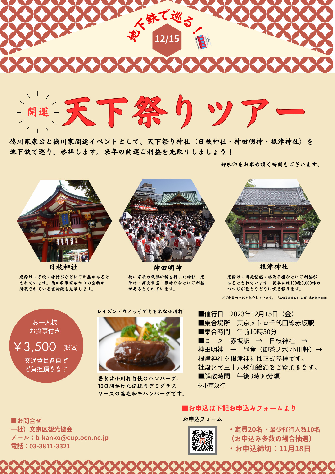 赤坂駅 → 日枝神社 → 神田明神 → 昼食(御茶ノ水 小川軒)→ 根津神社