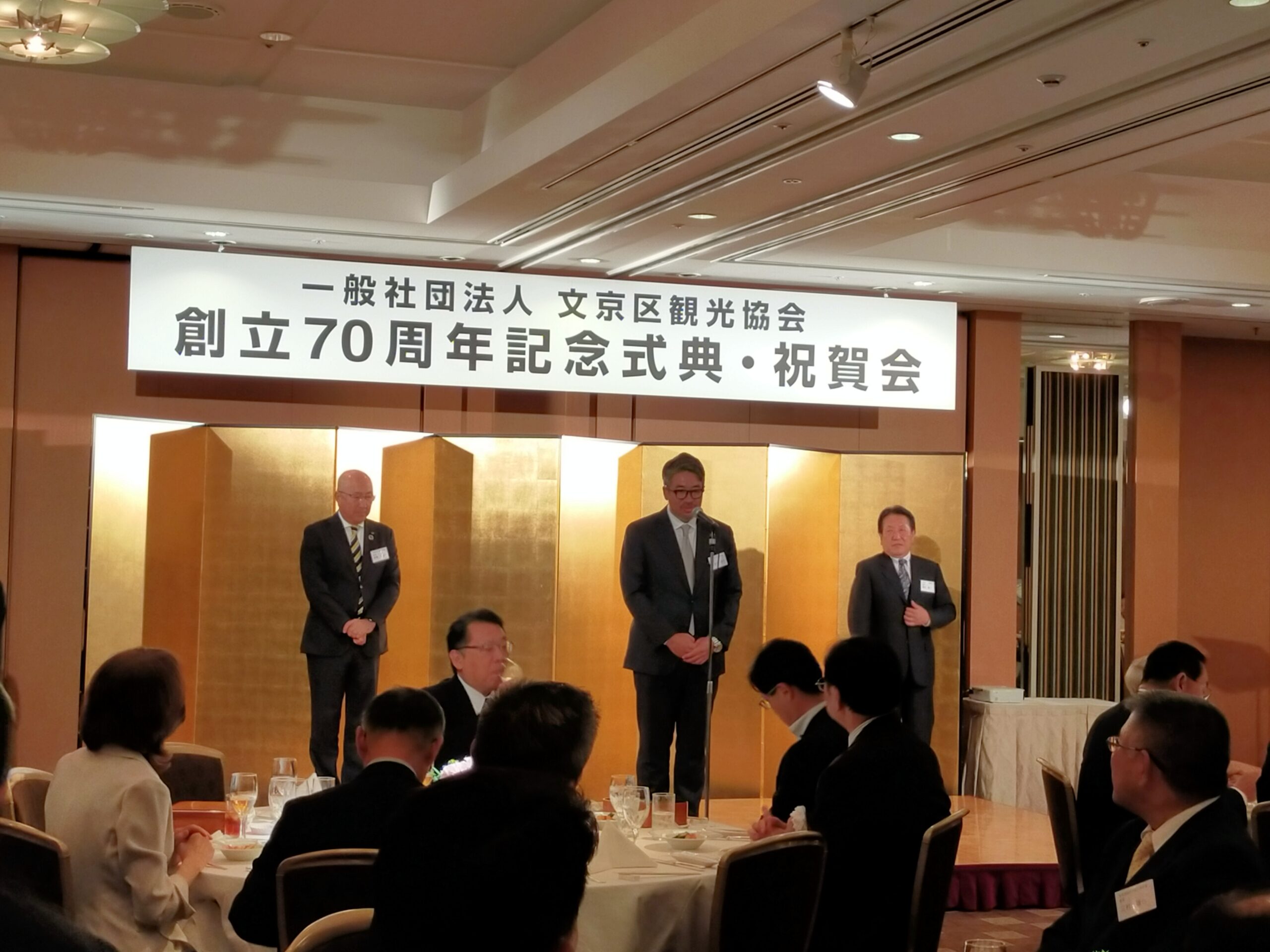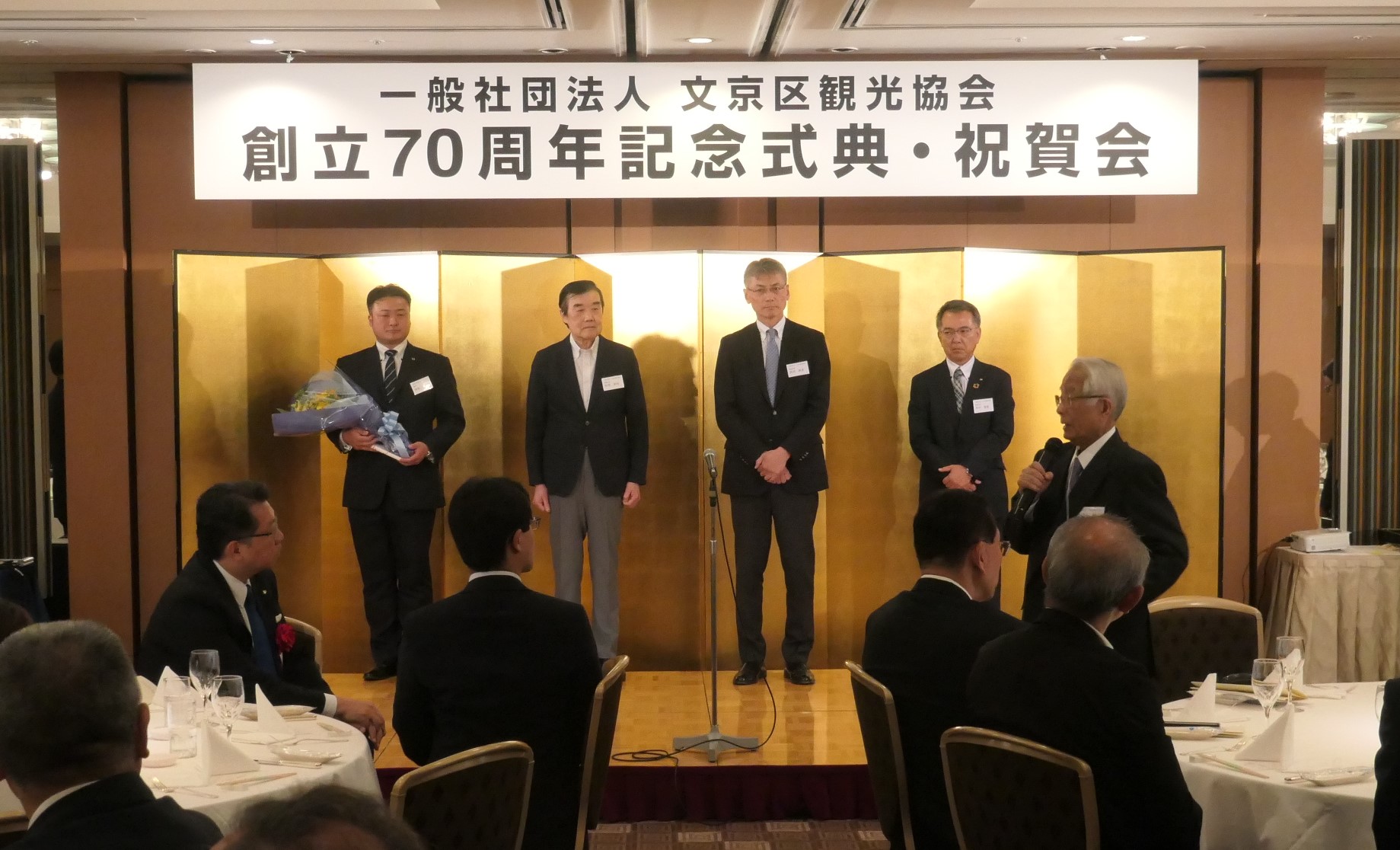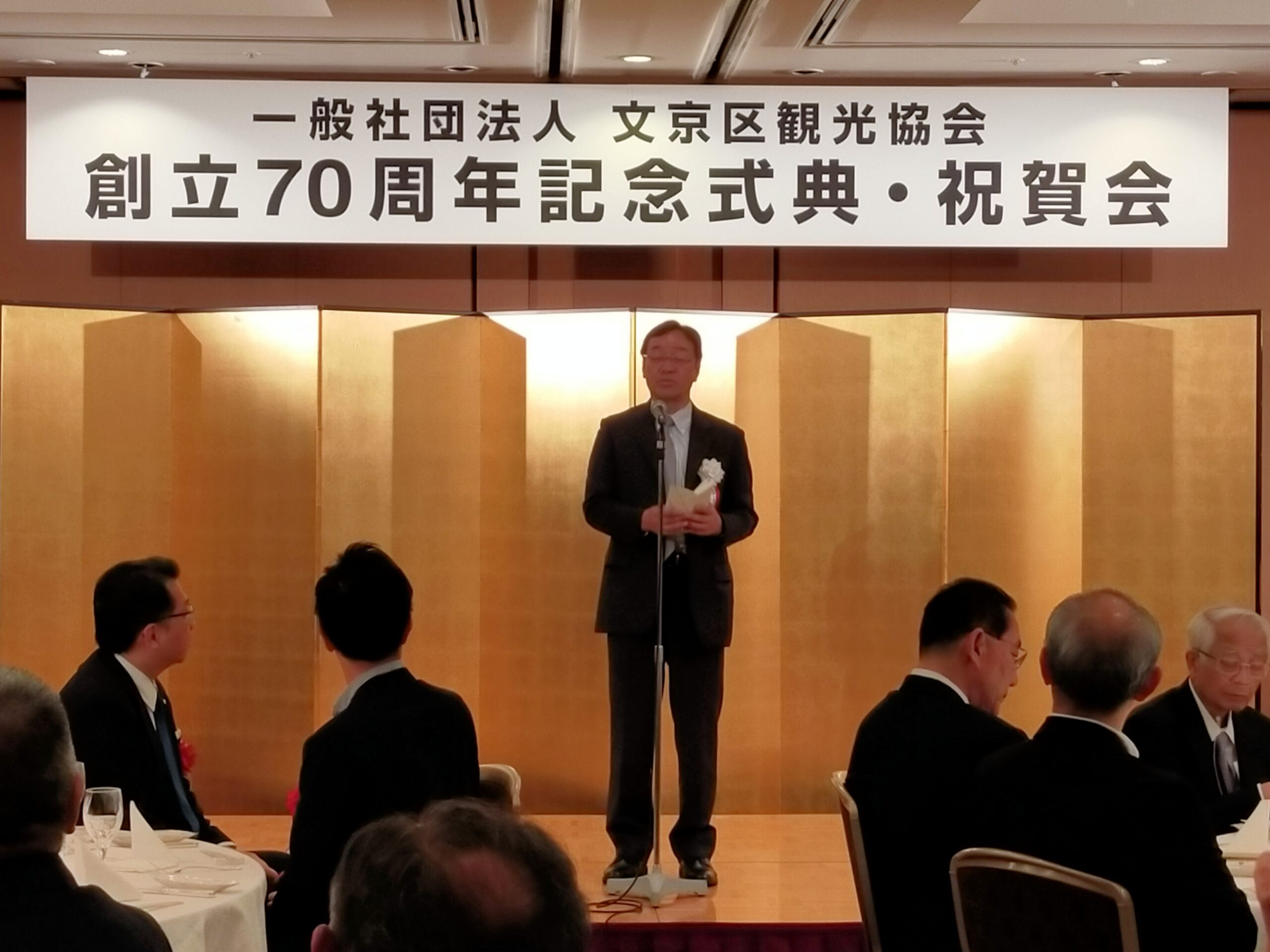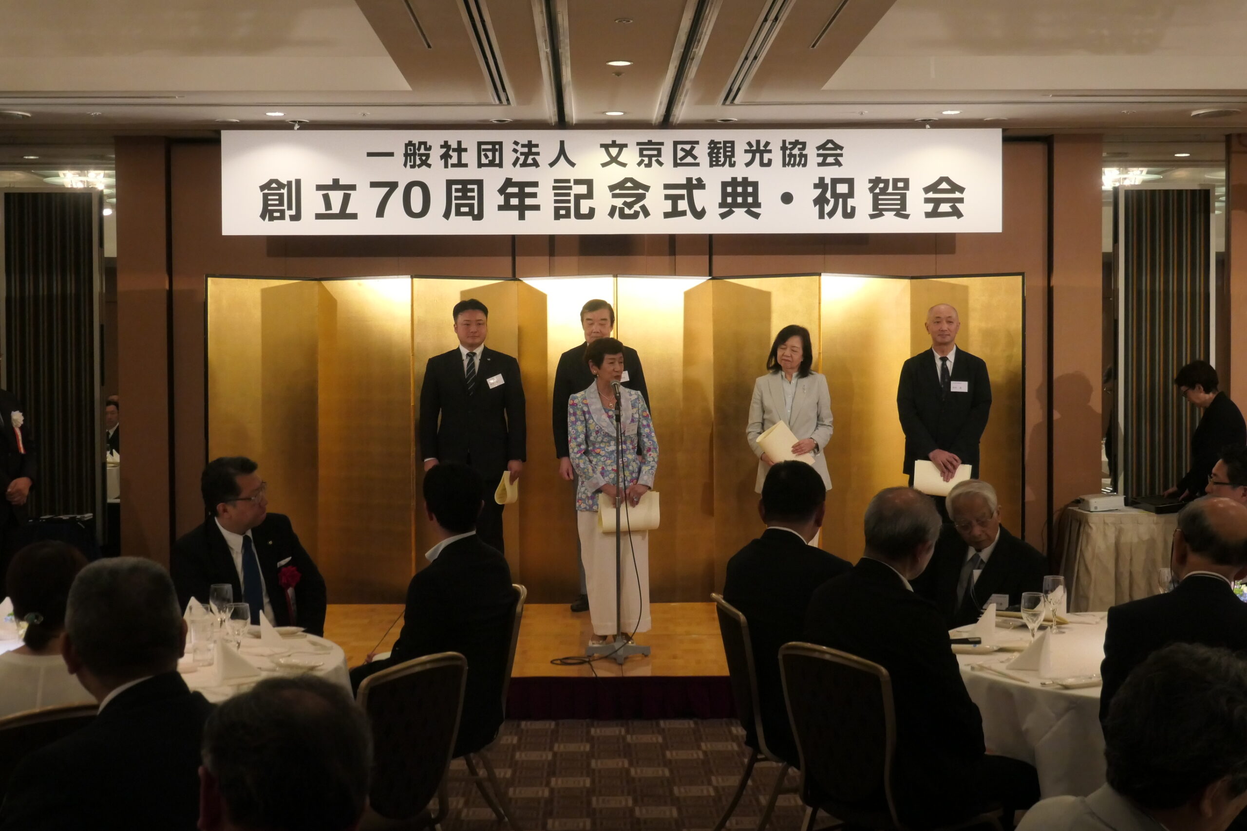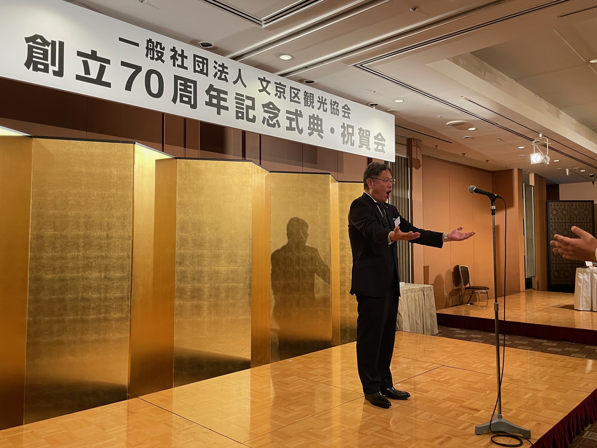 本日はご多用の中、文京区観光協会の創立70周年式典及び祝賀会に、成澤文京区長、白石文京区議会議長、鈴木隼人衆議院議員、鈴木庸介衆議院議員をはじめ、多くのご来賓の皆さま、大勢の会員の皆さまにご臨席を賜り、誠にありがとうございます。
