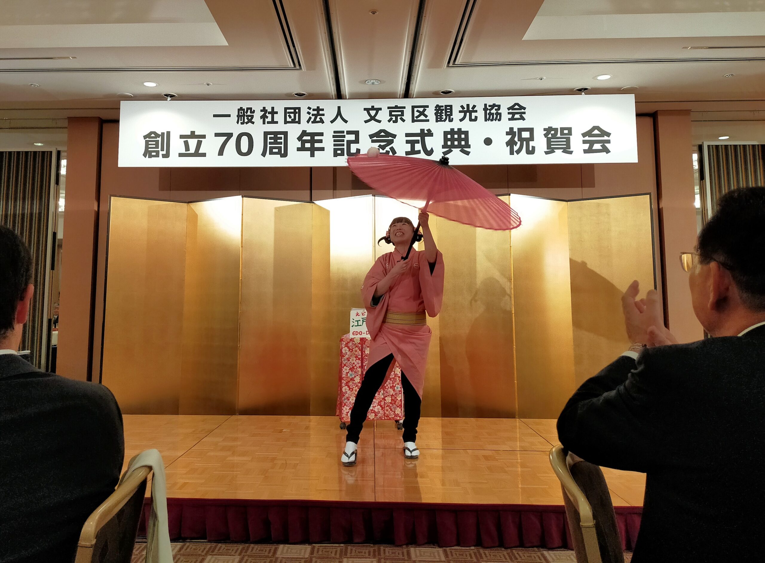 文京区観光協会は、昭和29年、1954年に創立され、創立以来、歴代会長をはじめ、多くの役員の皆さまのご努力や、会員の皆さまのご協力、また文京区及び関係諸団体の皆さまのご指導、ご支援により、70年という長きに亘り活動を続けることができました。そしてこのように盛大な形で創立70周年を迎えられることが出来ましたこと、心より厚く御礼を申し上げます。