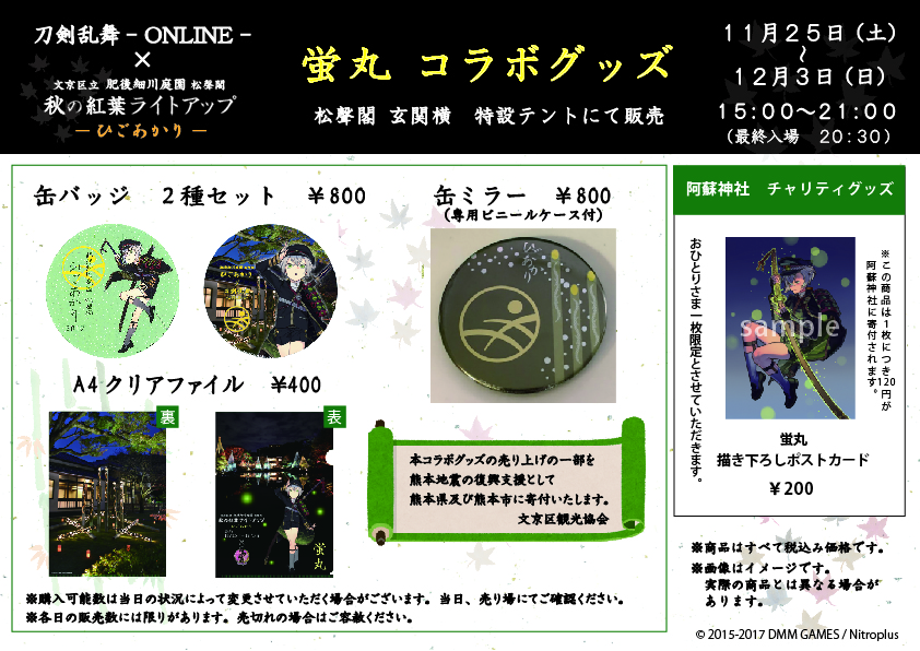 2017年11月25日(土)~12月3日(日)に開催された「秋の紅葉ライトアップ~ひごあかり~」とPCブラウザ&スマホアプリゲーム「刀剣乱舞-ONLINE-」のコラボレーションを記念し制作した、刀剣男士・蛍丸コラボグッズの販売におきまして、売上の一部を、熊本地震の復興支援として熊本県及び熊本市にそれぞれ寄付いたしました。