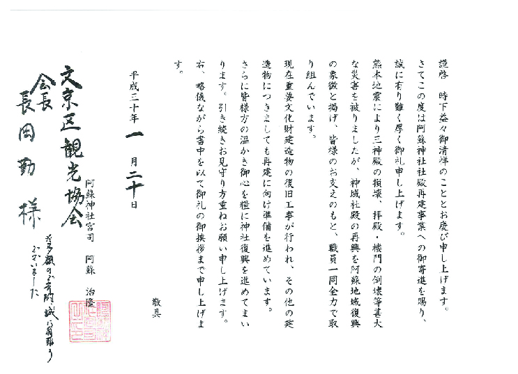 【寄付の報告】熊本地震復興支援および阿蘇神社復興支援義援金について