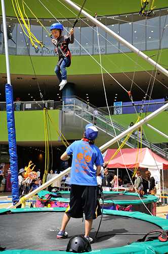 「飛ぶ子ども、見守る若者」