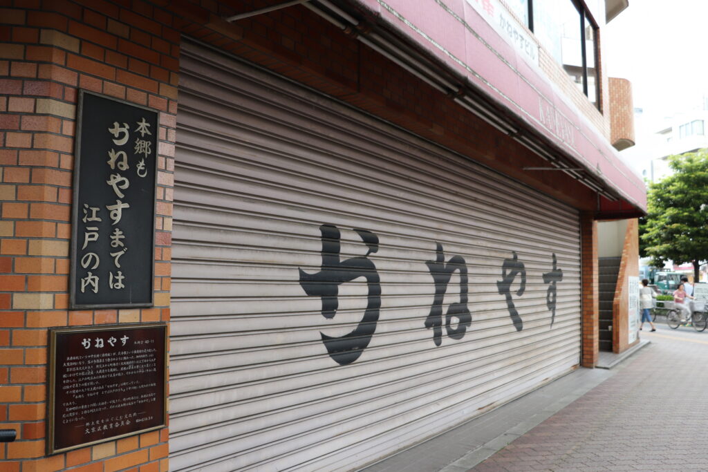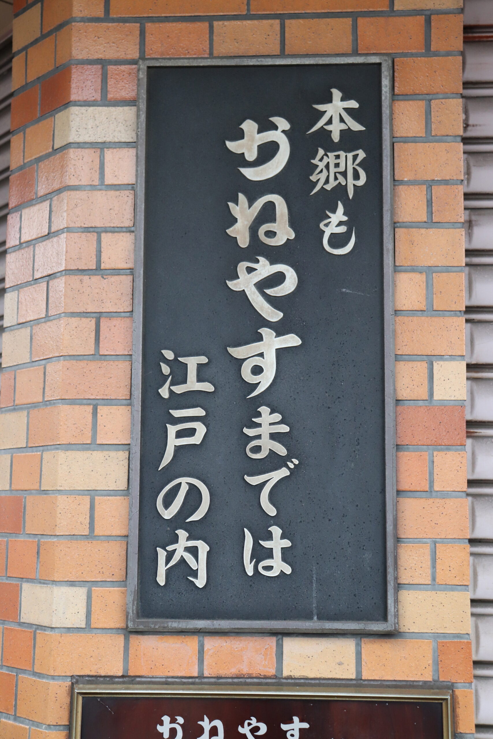 町奉行の大岡越前守が耐火のため、こ の地から南側を土蔵造りや塗屋にするこ とを命じ、「本郷もかねやすまでは江戸の内」という川柳が生まれました。「かねやす」は、享保年間(1716~36)に乳香散という歯磨き粉を売って繁盛しました。洋品店として近年まで営業していました。