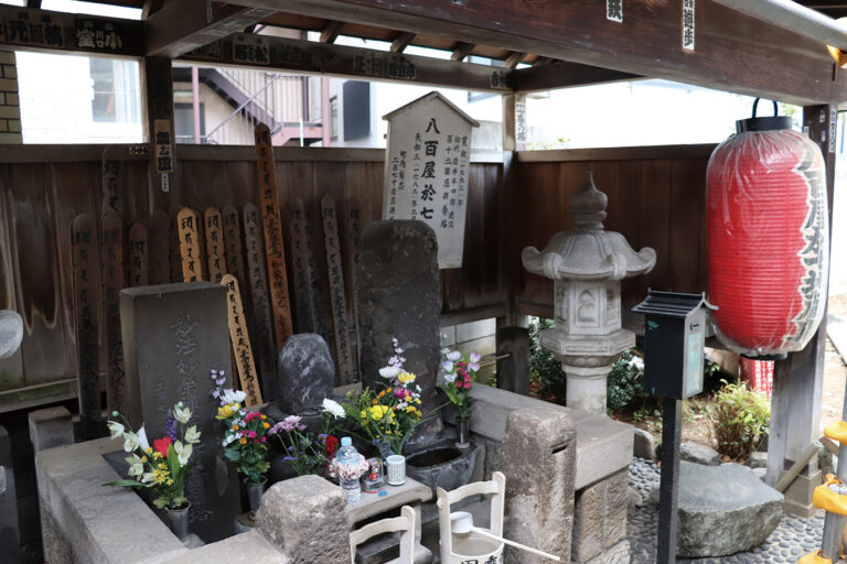 天台宗の寺院・円乗寺の境内には、井原西鶴の『好色五人女』などで有名なお七の墓があります。天和の大火により家が焼け、円乗寺での避難中に寺小姓佐兵衛と恋仲になったお七は、再建して戻った後、佐兵衛会いたさに放火をし、火あぶりの刑になりました。