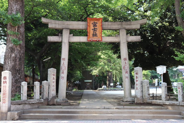 本郷村の名主が1573年、現在の東京大学の場所に、駿河の富士浅間社を勧請。1628年に元々駒込の地にあった創建不詳の富士塚(現在地)に遷座し、合祀されました。拝殿は富士山に見立てた山の上にあり、江戸時代の富士信仰の拠点の1つとなりました。6月末から7月初めの山開きの行事では賑わいを見せます。